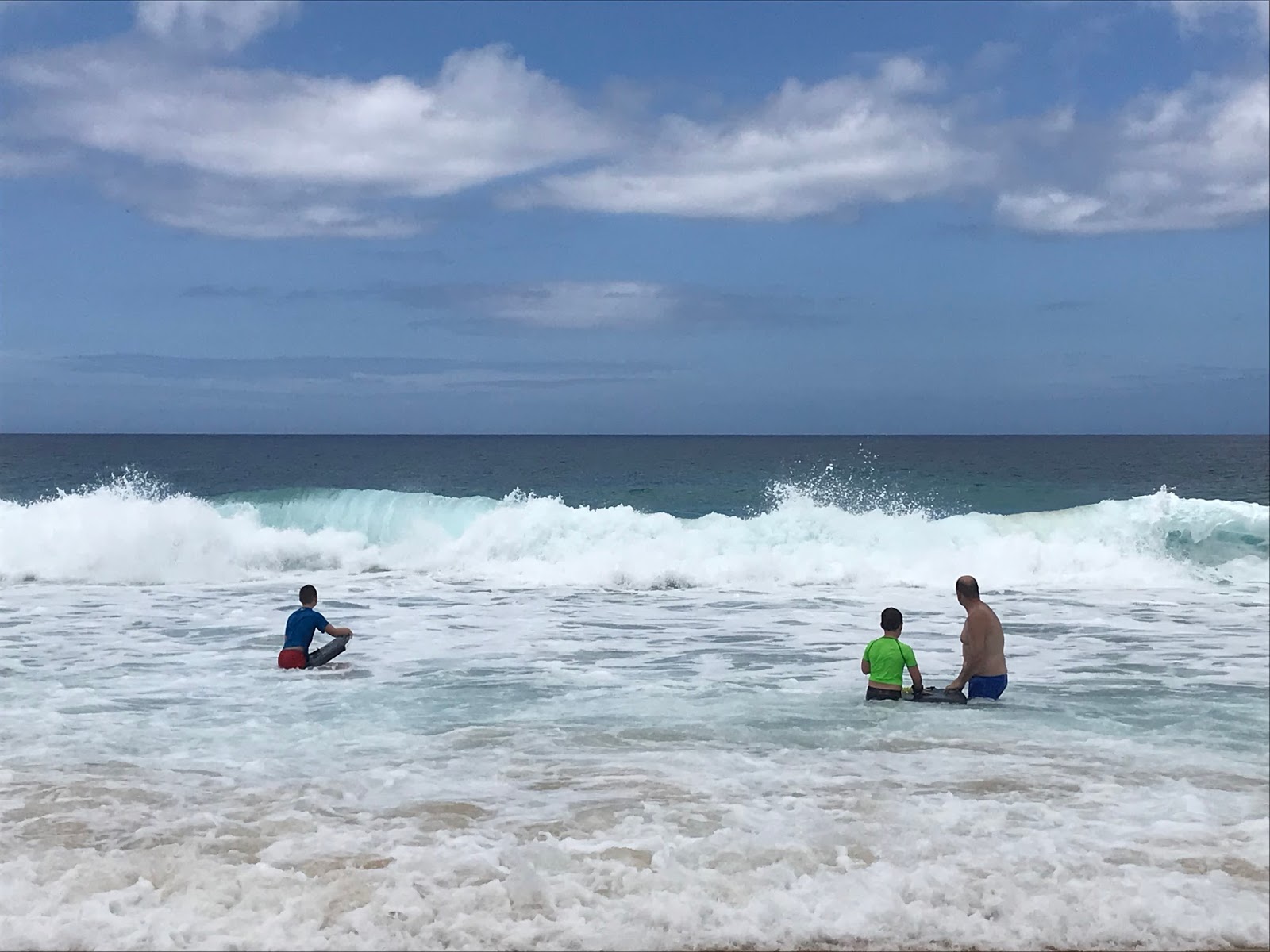 We moved to a new beach and let the kids explore the waves with their rental boards. The life guard warned us to stay close to shore, and to help the kids get the feel for these big waves. |